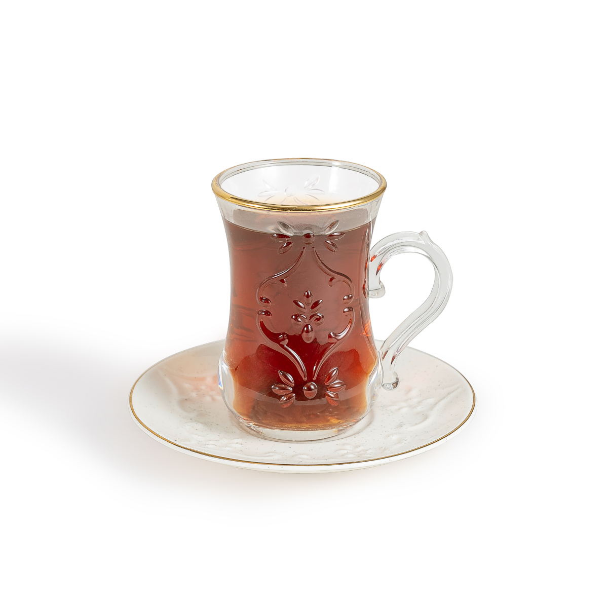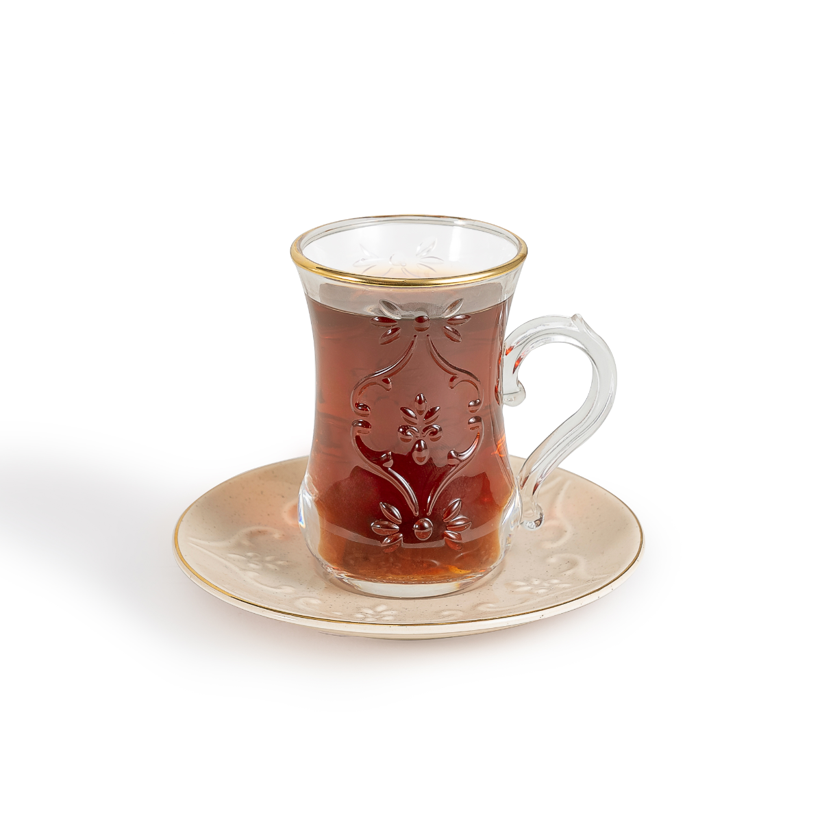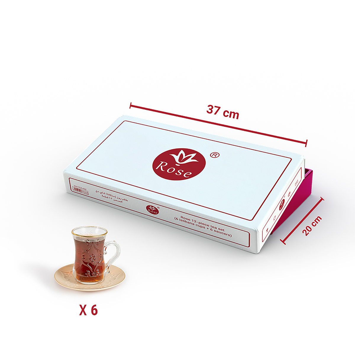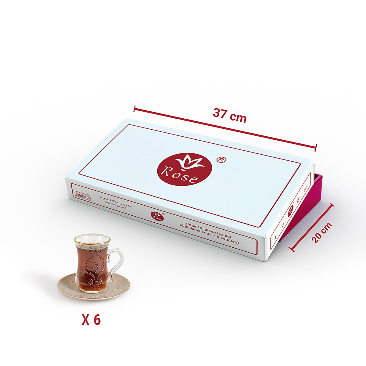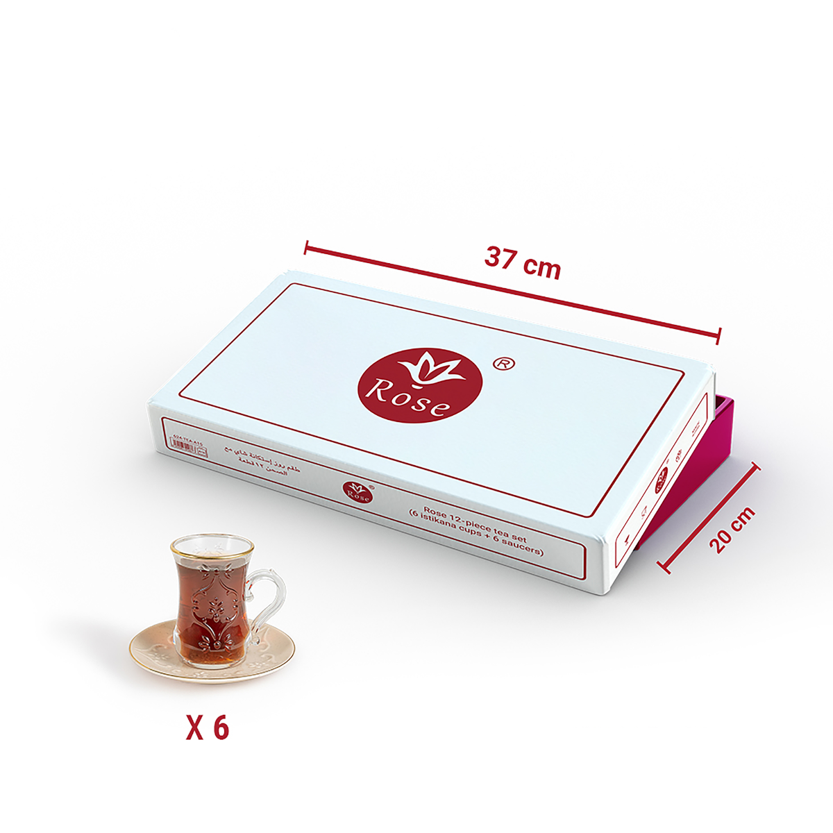 Made from high-quality porcelain, it includes 6 delicately designed tea cups and 6 matching saucers, perfect for enjoying Arabic or Turkish tea in style. The sleek design and smooth finish make it an elegant choice for home, hospitality, or gifting.