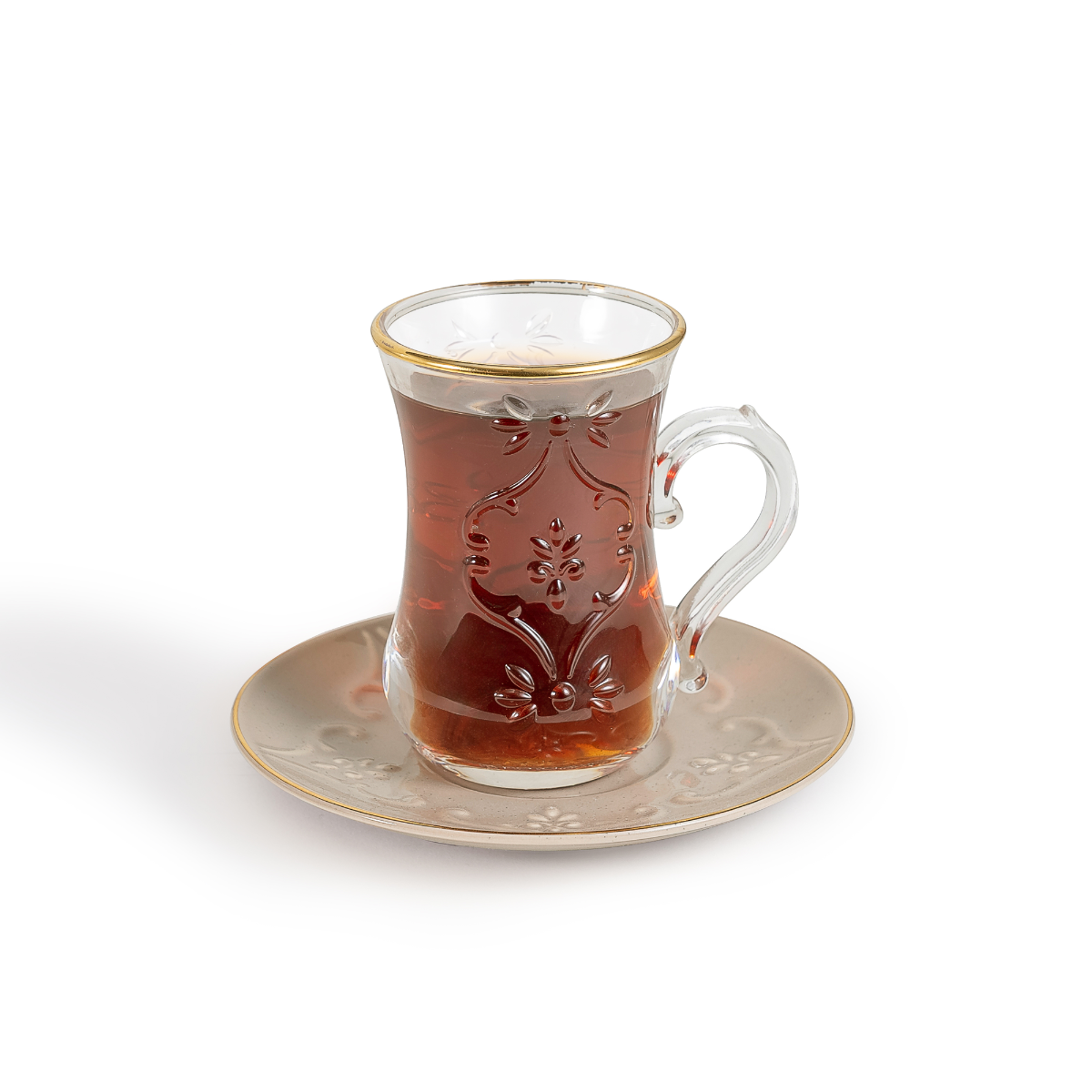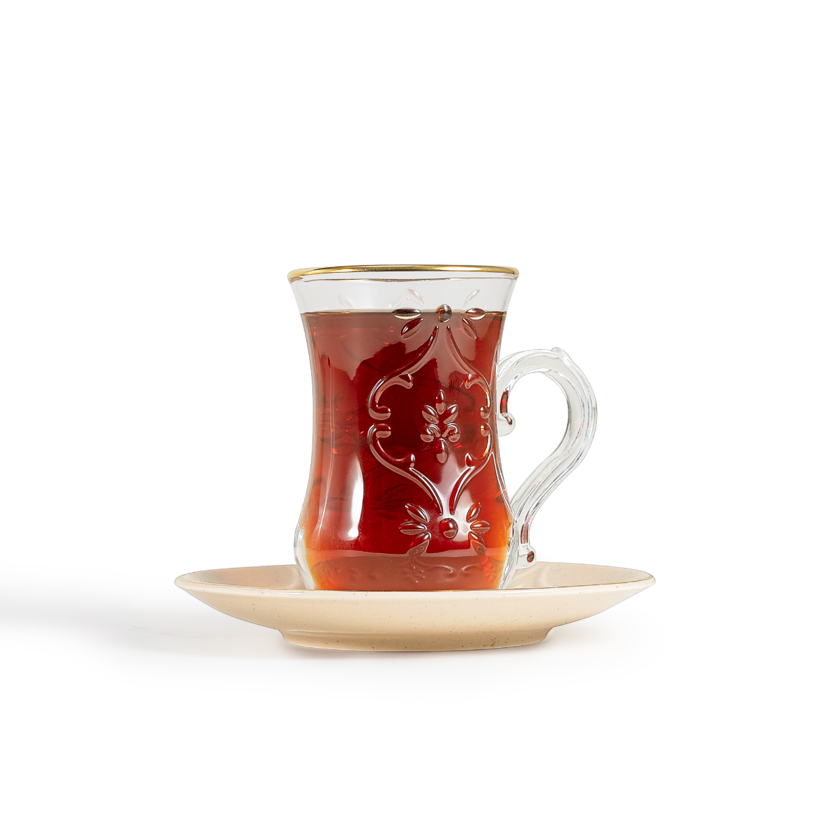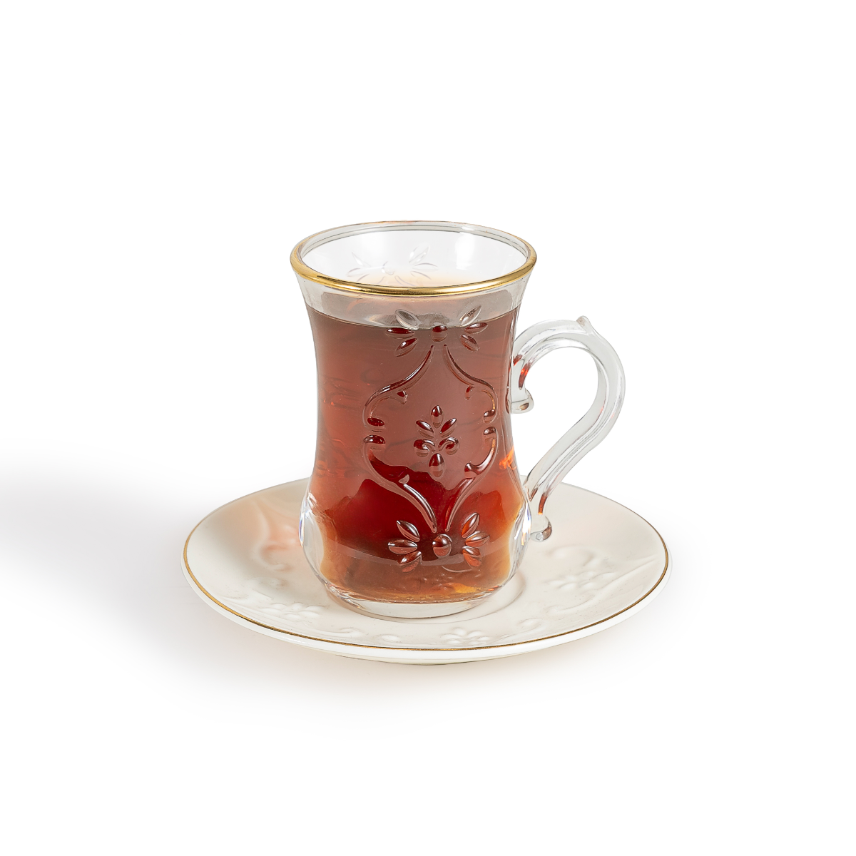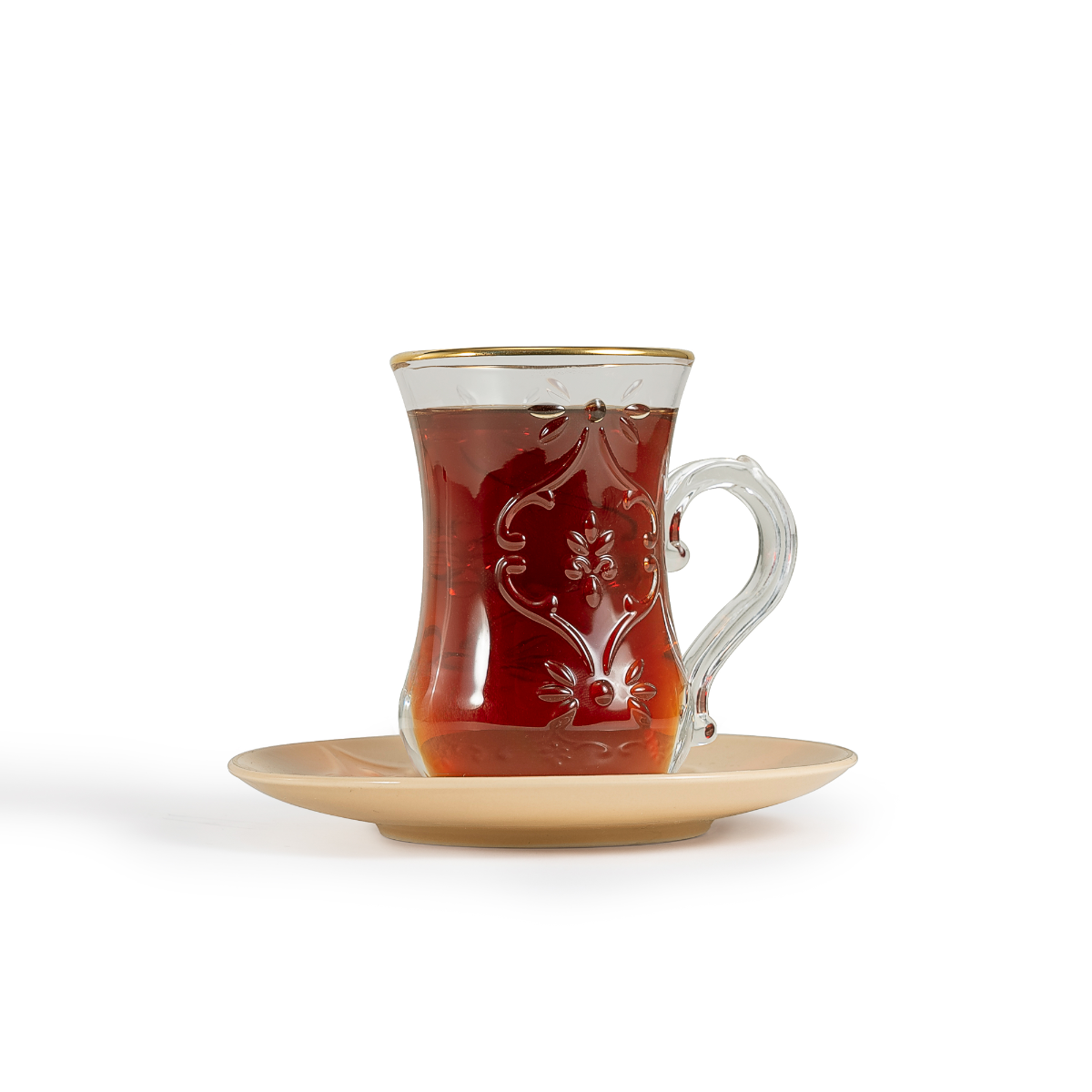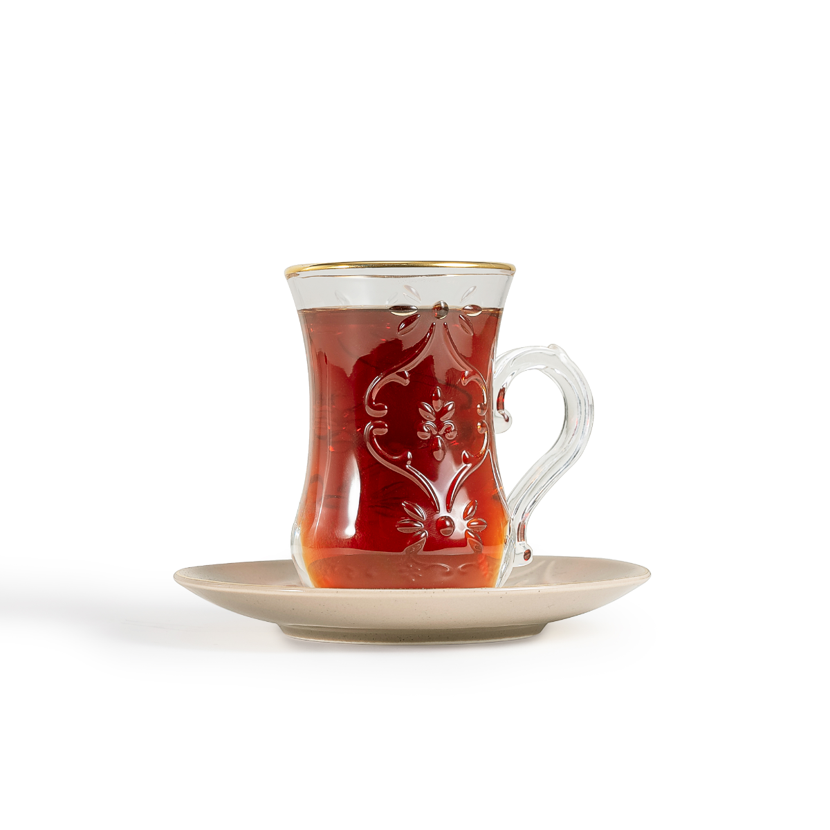 Made from high-quality porcelain, it includes 6 delicately designed tea cups and 6 matching saucers, perfect for enjoying Arabic or Turkish tea in style. The sleek design and smooth finish make it an elegant choice for home, hospitality, or gifting.